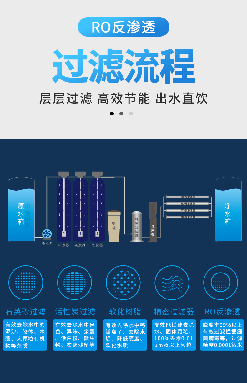 原水 → 原水箱 → 原水泵 →多介質(zhì)過(guò)濾器 (石英砂過(guò)濾器)→活性炭過(guò)濾器 →軟水處理器(添加阻垢劑裝置) → 精密過(guò)濾器 → 高壓泵 → 一級反滲透(RO)裝置 →紫外線(xiàn)殺菌裝置(臭氧殺菌裝置) → 用水點(diǎn)